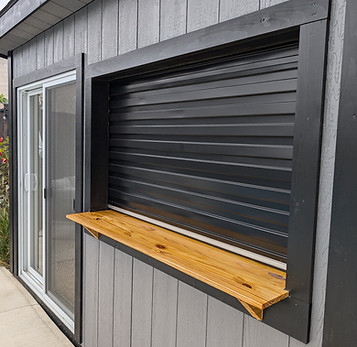 We recommend having a metal roll up door installed as it is the most stylish and functional option. Serving windows come complete with a pine counter finished with clear coat to add a stunning wood accent to the shed. Contact for Pricing.